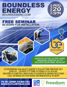 Join us on Sunday, August 20th, at 3pm for a 30 minute seminar on why now is the time to switch to Solar Power. Enjoy free food and drinks with a quick seminar put on by the nation’s leading Solar Panel provider.