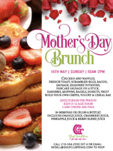 Our annual Mother’s Day Brunch is right around the corner. Email Nesell@golfclubtexas.com to RSVP for your preferred time. We will fill up quickly so make sure you get your reservations secured to take that special woman in your life out for a great start to the day!