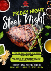 Join us for our always popular “Steak Night”. We will have limited seating so don’t procrastinate and email Nesell@golfclubtexas.com to RSVP your time slot!