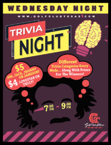 Every Wednesday is Trivia Night!! Get here and show off your skills, also enjoy all night Happy Hour that starts at 5pm every night until close at 10pm!